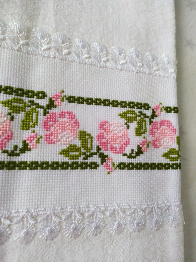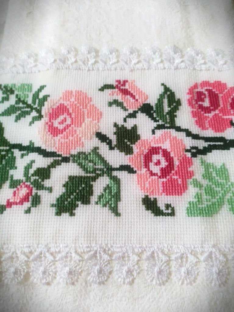 Это сувенирное полотенце из прекрасного жакардового белорусского льна отделано каймой, на которой цветут чайные розы. Вышила на одном дыхании, наслаждаясь нежными оттенками и мечтая о весне.